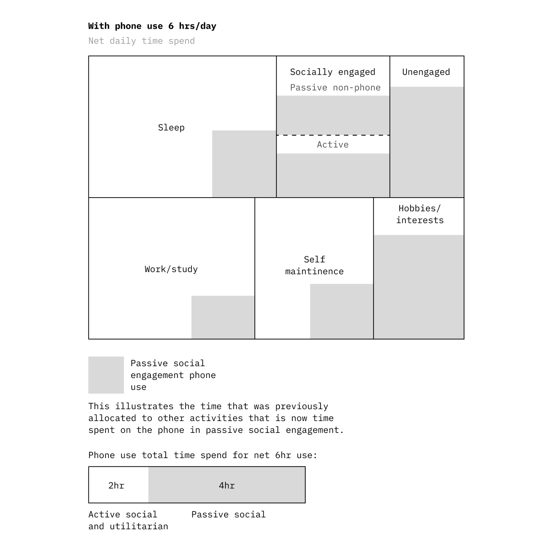 Titled “Handling the New World”, the section starts off by looking at analogous points in history, and their problems. We look at other historical instances of surplus have disrupted national health interests, and then we attempt to rigorously define the current problems of phone overuse. It presents a model that can allow readers to quantify and measure their consumption, and understand the influence of different types of consumption.