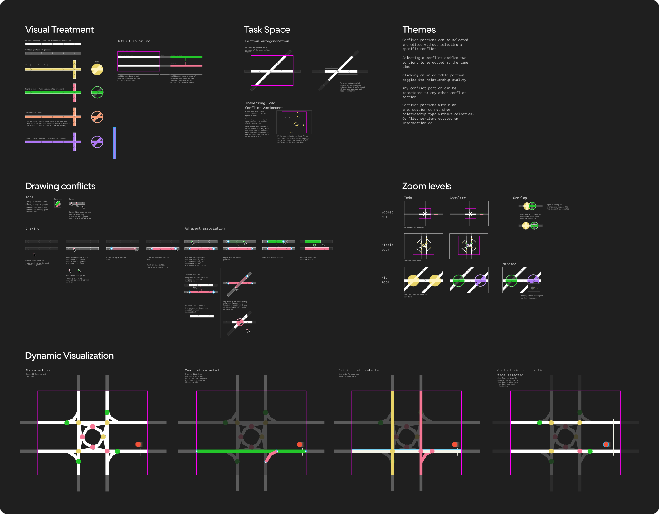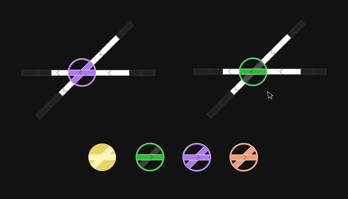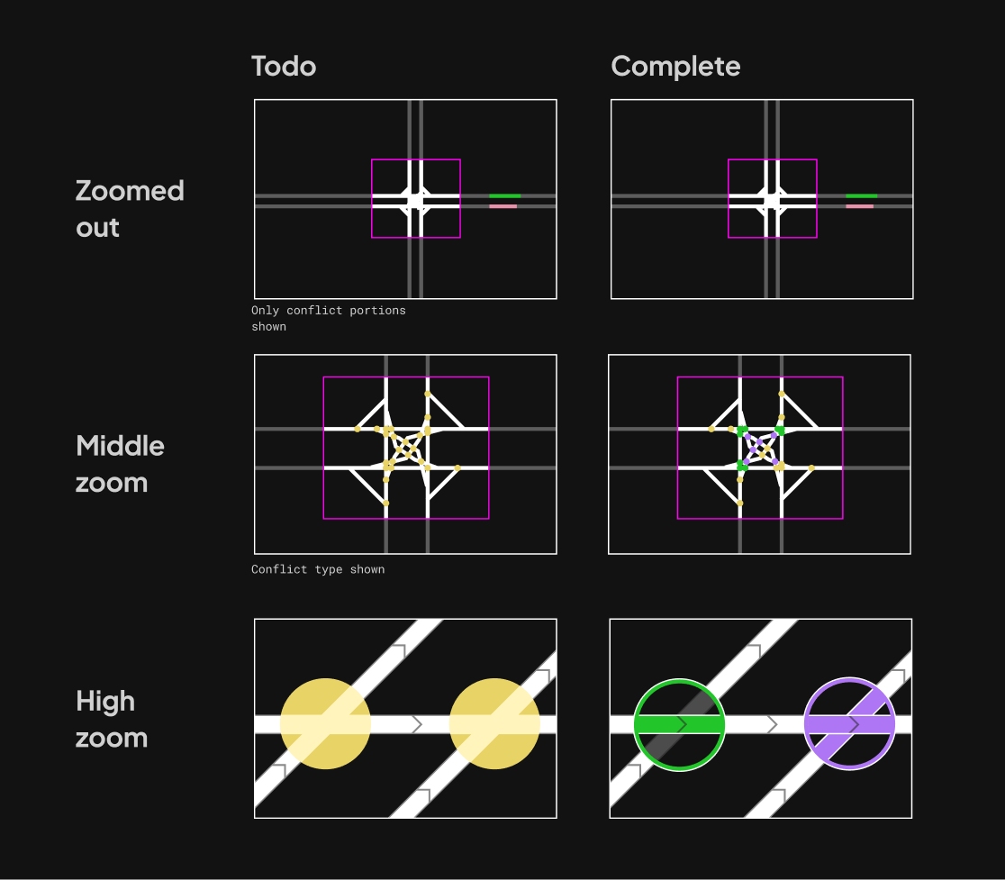 Conflicts that needed a relationship assigned would be yellow. Right-of-way relationships visually indicated the dominant path. To assign relationships quickly, users could use hotkeys to quickly cycle through conflicts in their view, and use additional hotkeys to assign relationships.