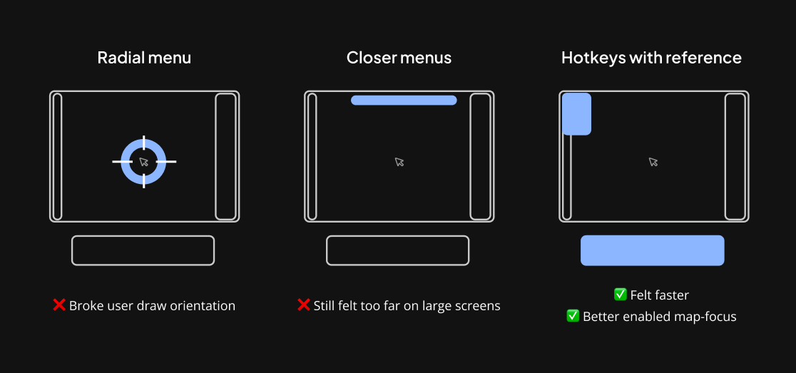 Users liked that shortcuts didn't require them to move their mouse from their active work area. This allowed them to maintain their focus, and mouse position on the map, which helped them continue tasks more quickly.