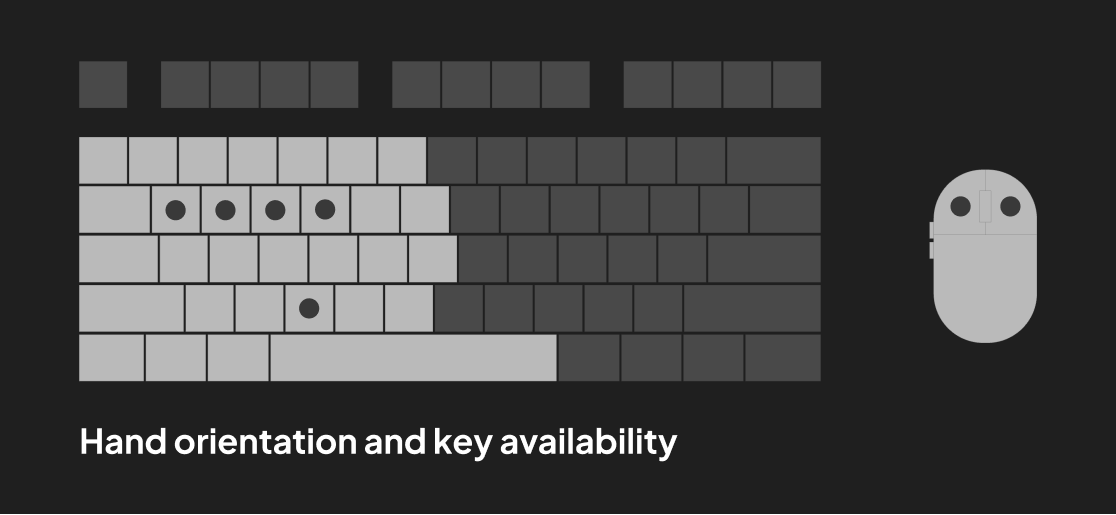 To enable our users to maintain their focus on the screen, they must have their hands over one primary section of the keyboard. Because our users also need to keep their right hand on the mouse for drawing and selection, that leaves only about 60% of the keys on the keyboard as viable shortcut options to be used by the left hand.